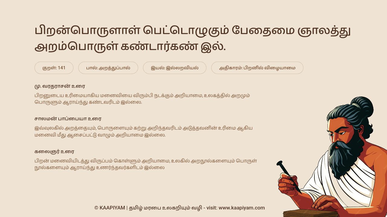 பிறன்பொருளாள் பெட்டொழுகும் பேதைமை ஞாலத்து — அறம்பொருள் கண்டார்கண் இல். | குறள் எண் - 141