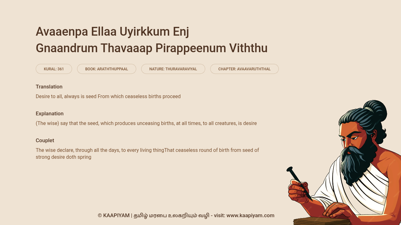 அவாஎன்ப எல்லா உயிர்க்கும் எஞ்ஞான்றும் — தவாஅப் பிறப்பீனும் வித்து. | குறள் எண் - 361