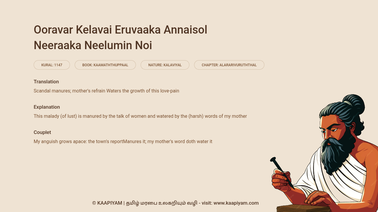 ஊரவர் கெளவை எருவாக அன்னைசொல் — நீராக நீளும்இந் நோய். | குறள் எண் - 1147
