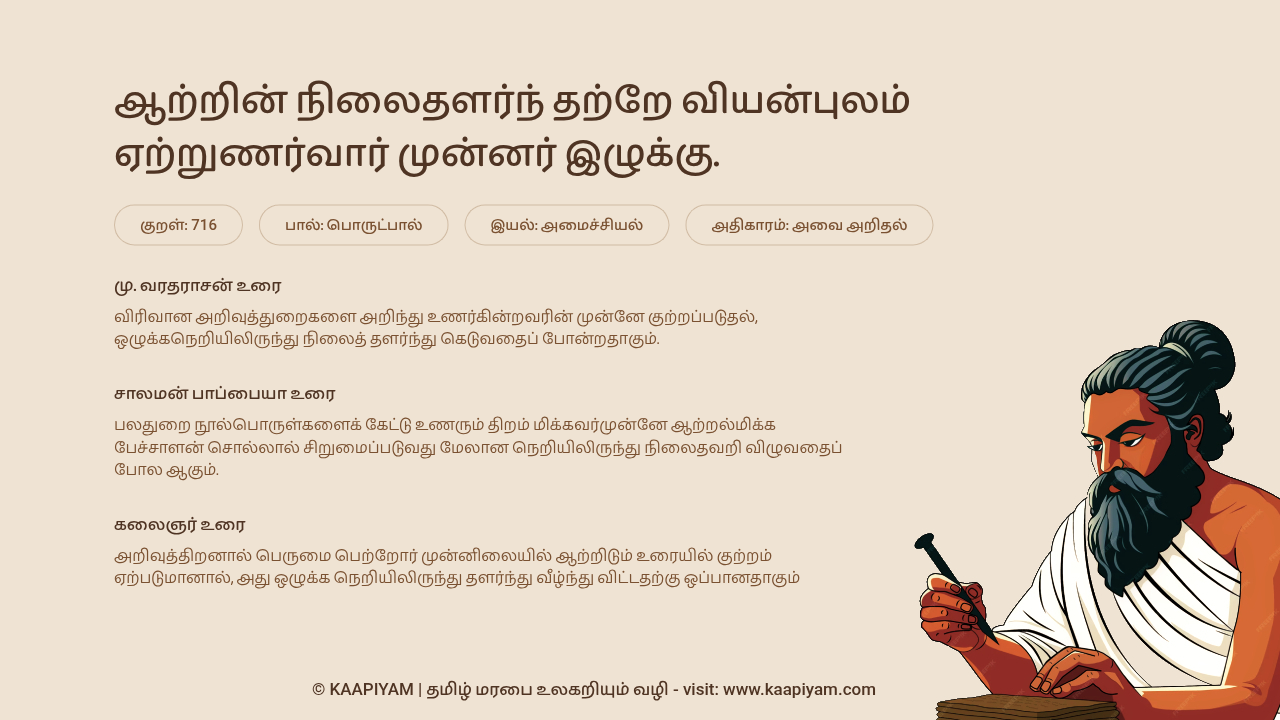 ஆற்றின் நிலைதளர்ந் தற்றே வியன்புலம் — ஏற்றுணர்வார் முன்னர் இழுக்கு. | குறள் எண் - 716