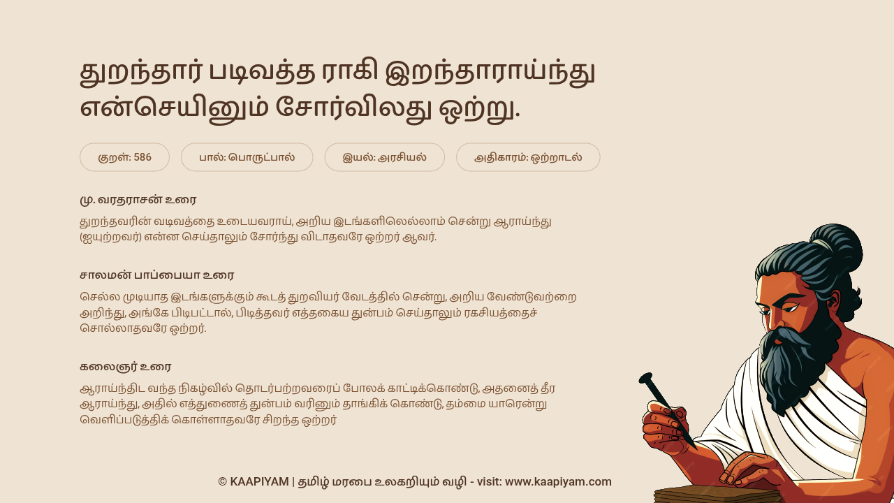 துறந்தார் படிவத்த ராகி இறந்தாராய்ந்து — என்செயினும் சோர்விலது ஒற்று. | குறள் எண் - 586
